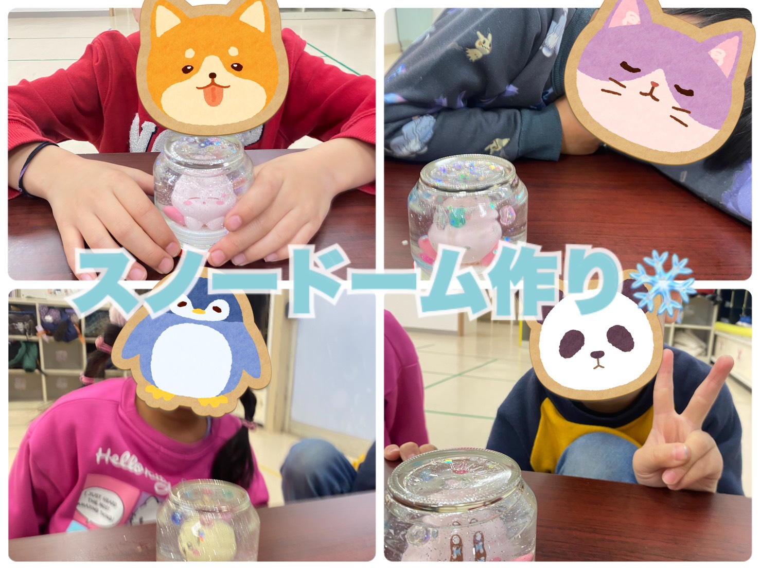 今回は、小さな瓶に水、洗濯のり、マスコット、グリッター、ホログ ラム、ビーズを入れて自分だけのスノードームを作りました。